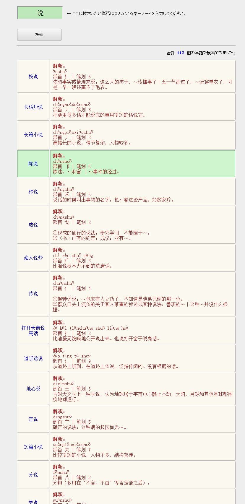漢字 「 説 」の含んでいる単語の検索結果を下記に示します。