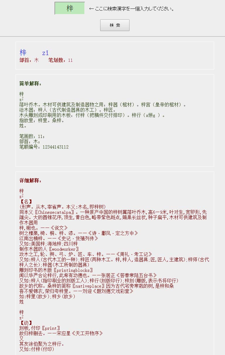 参考として、漢字 「 梓 」の検索結果は下記に記載してあります。